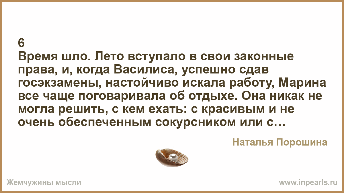 Время шло. Лето вступало в свои законные права, и, когда Василиса, успешно сдав госэкзамены, настойчиво искала работу, Марина все чаще поговаривала об отдыхе. Она никак не могла решить, с кем ехать: с красивым и не очень обеспеченным сокурсником или с состоятельным поклонником, к достоинствам которого можно отнести деньги, а к недостаткам — возраст и занудство. Выбор спутника определял маршрут отпуска, и Марина склонялась к последнему варианту. К немалому огорчению, Игорь на ее звонки не отвечал, и хотя окончательного поражения она пока не признавала, но иногда сомнения закрадывались в душу. Марина не раз задавала себе вопросы: где же она ошиблась, в чем просчиталась?