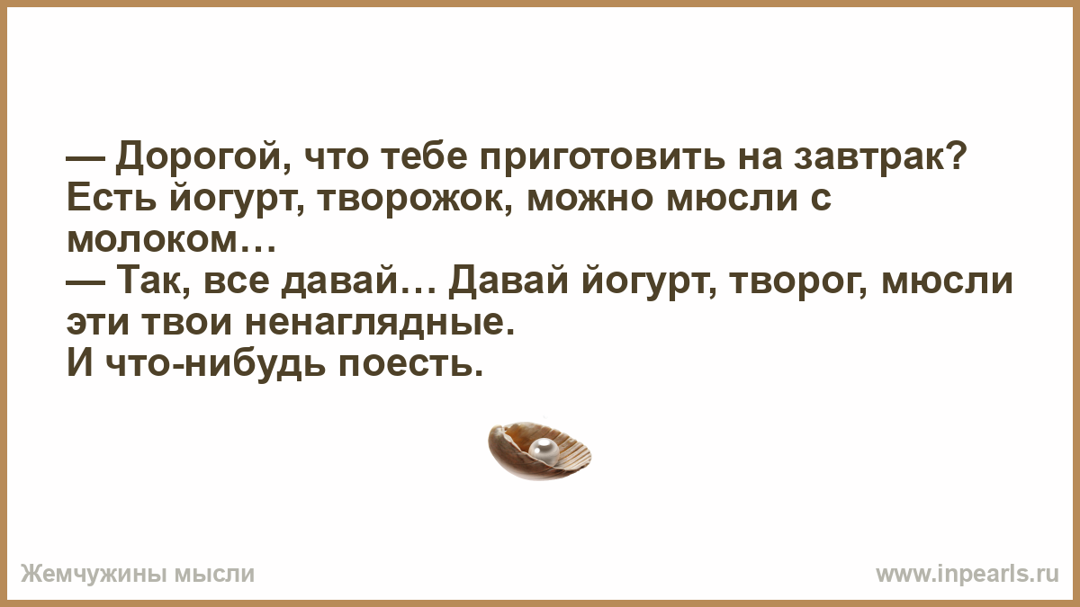 — Дорогой, что тебе приготовить на завтрак? Есть йогурт, творожок, можно мюсли с молоком…