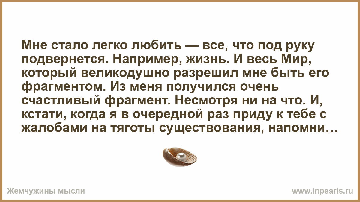 Мне стало легко любить — все, что под руку подвернется. Например, жизнь. И весь Мир, который великодушно разрешил мне быть его фрагментом. Из меня получился очень счастливый фрагмент. Несмотря ни на что. И, кстати, когда я в очередной раз приду к тебе с жалобами на тяготы существования, напомни мне этот разговор. В минуту слабости бывает полезно вспомнить, как в действительности обстоят дела.