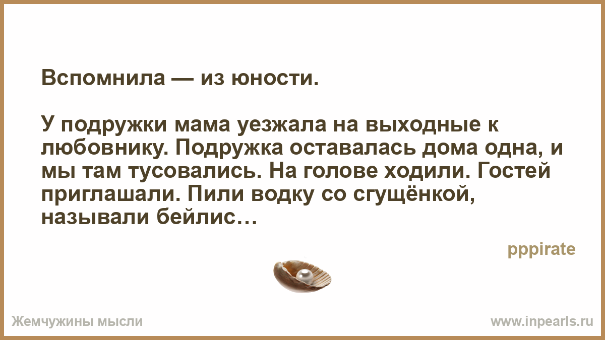 У подружки мама уезжала на выходные к любовнику. Подружка оставалась дома одна, и мы там тусовались. На голове ходили. Гостей приглашали. Пили водку со сгущёнкой, называли бейлис.