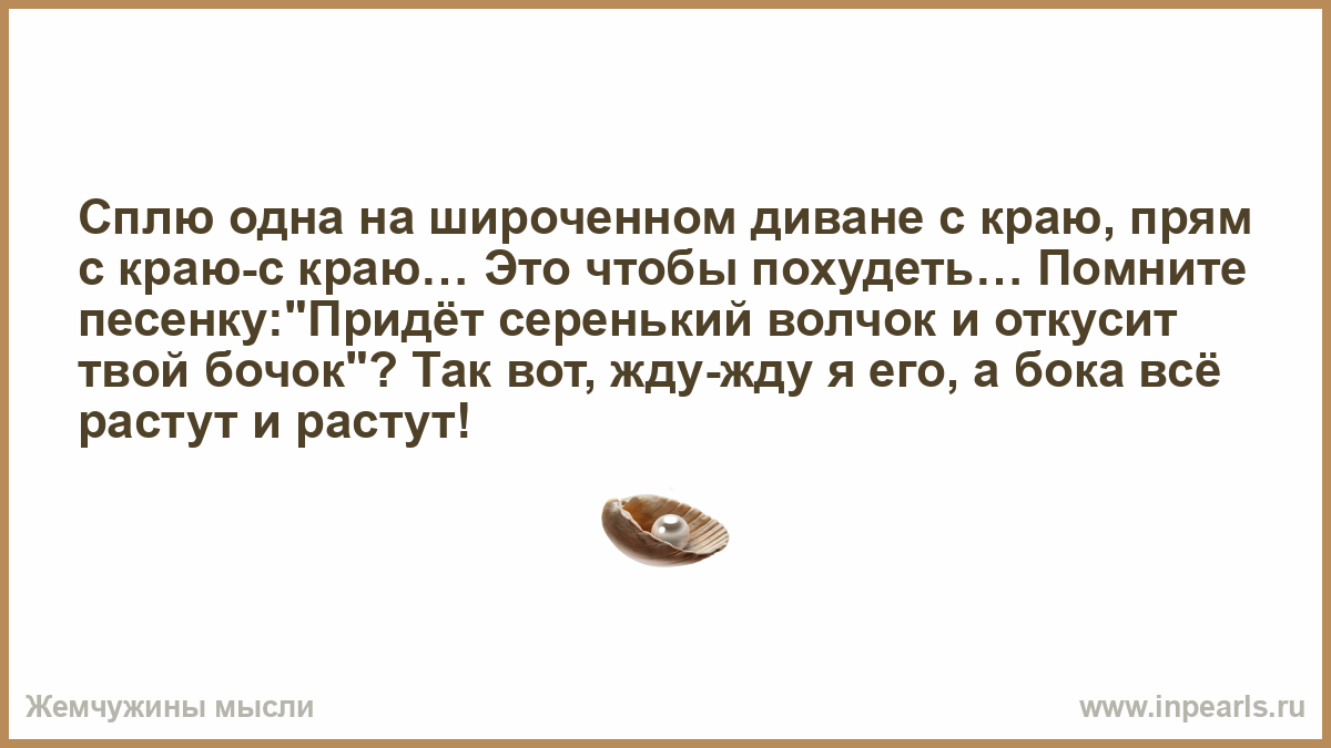 Сплю одна на широченном диване с краю, прям с краю-с краю… Это чтобы похудеть… Помните песенку:"Придёт серенький волчок и откусит твой бочок"? Так вот, жду-жду я его, а бока всё растут и растут!