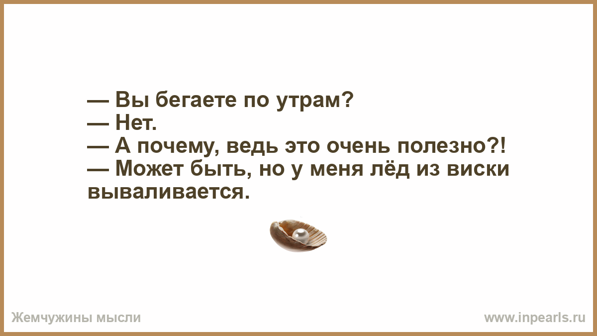 — Вы бегаете по утрам? — Нет. — А почему, ведь это очень полезно?! — Может быть, но у меня лёд из виски вываливается.