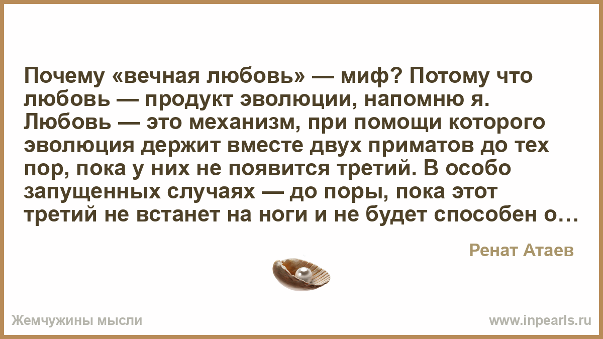Почему «вечная любовь» — миф? Потому что любовь — продукт эволюции, напомню я. Любовь — это механизм, при помощи которого эволюция держит вместе двух приматов до тех пор, пока у них не появится третий. В особо запущенных случаях — до поры, пока этот третий не встанет на ноги и не будет способен о себе позаботиться сам. То есть лет до четырех примерно. В четыре года пещерный ребенок уже сам собирал себе пищу. Кто виноват, что мы так далеко шагнули от каменных технологий и нам уже не достаточно четырех лет, чтобы поднять новый организм до уровня полноценного члена общества? Кто виноват, что у нас такое долгое, затягивающееся на 16−24 года, детство, в которое надо вместить обучение такому количеству важных для выживания вещей, что мы превратили этот процесс в специальный общественный институт — образование? Кто виноват, что наши инстинкты так сильно отстают в развитии от нашего культурного и технического прогресса? Чтобы удержать пару вместе на тот период, который нужен для полноценного воспитания ребенка (дольше чем на 4 года), человек придумал институт брака, который не имеет ровно никакой поддержки в наших инстинктах (иначе его бы не пришлось укреплять законами и традицией), но дико полезен для человеческого общества — тут тебе и профилактика ЗППП (моногамия рулит) и экономические факторы (семья — ячейка социума, есть имущественная преемственность через наследование ресурсов) и множество других… Короче говоря Кризисы отношений, которые у миллиардов человеческих пар во всем мире коррелируют с назваными сроками — 1 год и 4 года — еще одно маленькое доказательство: а) наших биологических корней (всего оных доказательств мириады: из них фактически состоит целый ряд естественных наук) и б) реальности существования гениального, хоть и напрочь слепого, архитектора по имени Эволюция. Вот что интересно: гениального не вопреки, а, скорее, благодаря множеству постоянно совершаемых им ошибок. Всем спасибо за отнятое время.