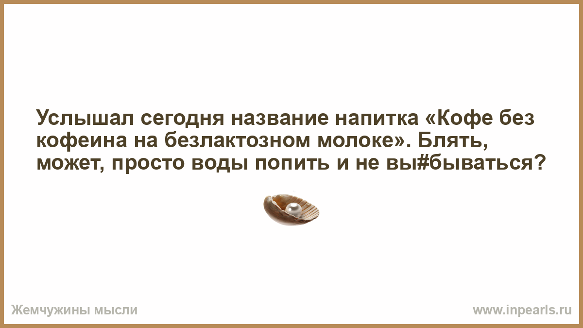 Услышал сегодня название напитка «Кофе без кофеина на безлактозном молоке». Блять, может, просто воды попить и не вы#бываться?