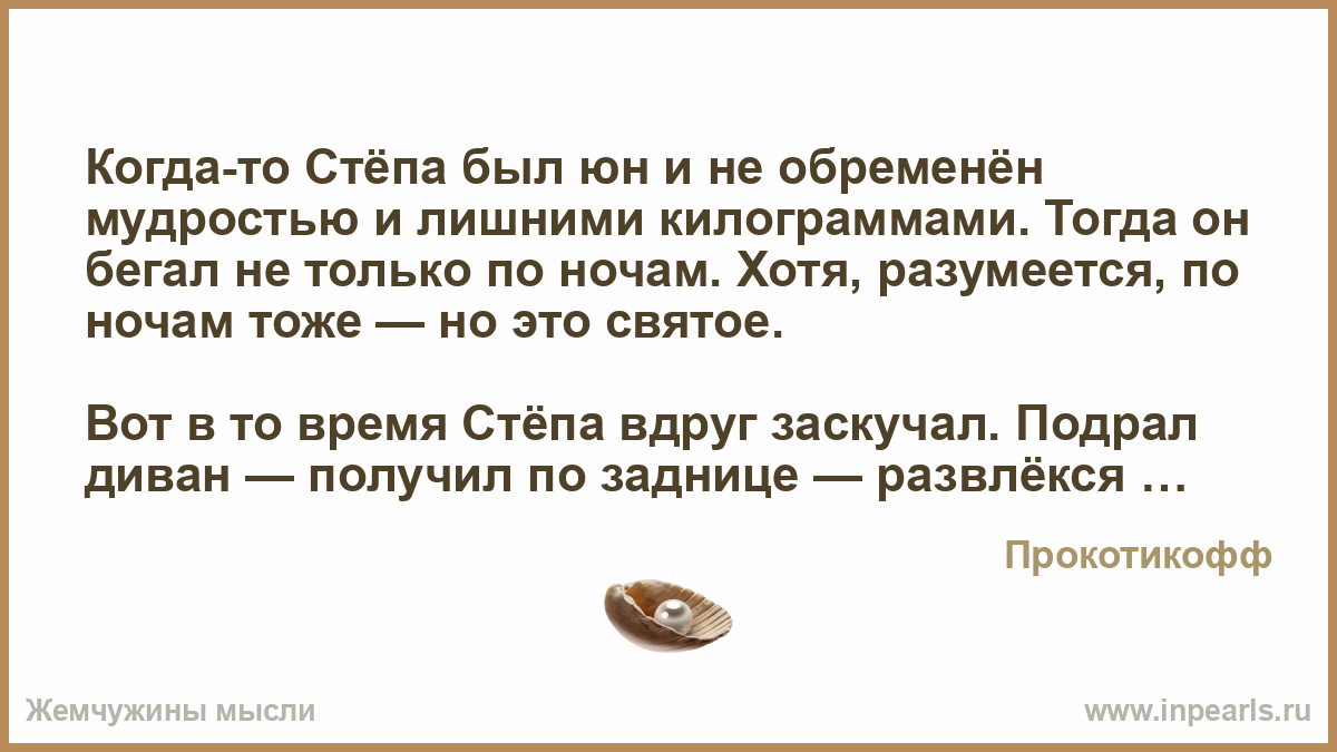 Когда-то Стёпа был юн и не обременён мудростью и лишними килограммами. Тогда он бегал не только по ночам. Хотя, разумеется, по ночам тоже — но это святое.