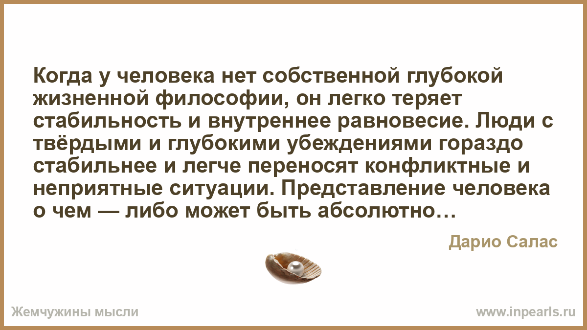 Когда у человека нет собственной глубокой жизненной философии, он легко теряет стабильность и внутреннее равновесие. Люди с твёрдыми и глубокими убеждениями гораздо стабильнее и легче переносят конфликтные и неприятные ситуации. Представление человека о чем — либо может быть абсолютно ошибочным, но если оно твердое, то это дает ему эмоциональную стабильность. Наиболее ценно когда собственные идеи сформировались на основе высшего понимания, а не веры.
