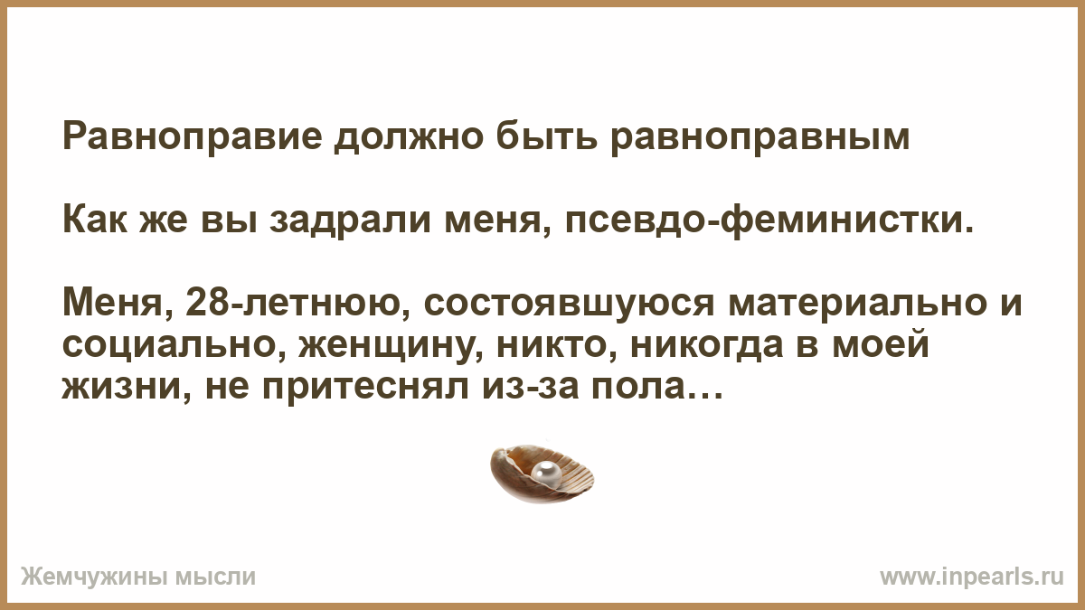Хватит прикрывать свою физическую слабость, мелочные желаньица и скудные умишки псевдо-феминизмом. Равноправие должно быть равноправным