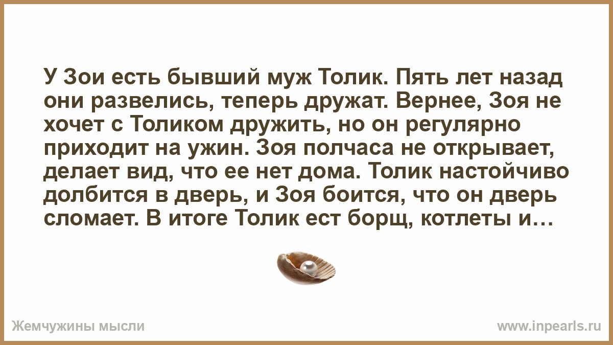 У Зои есть бывший муж Толик. Пять лет назад они развелись, теперь дружат. Вернее, Зоя не хочет с Толиком дружить, но он регулярно приходит на ужин. Зоя полчаса не открывает, делает вид, что ее нет дома. Толик настойчиво долбится в дверь, и Зоя боится, что он дверь сломает. В итоге Толик ест борщ, котлеты и яблочный компот, жалуется на жизнь, на то, что бабы совсем обнаглели.