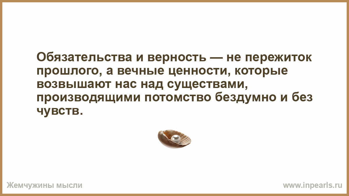 Обязательства и верность — не пережиток прошлого, а вечные ценности, которые возвышают нас над существами, производящими потомство бездумно и без чувств.