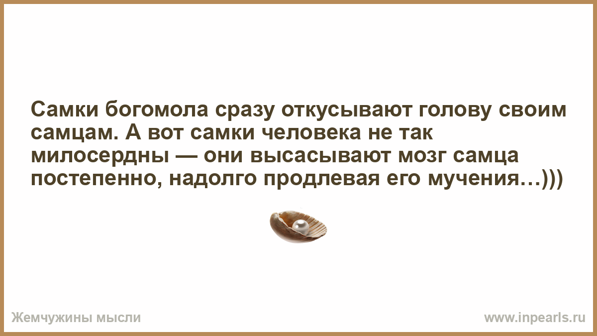 Самки богомола сразу откусывают голову своим самцам. А вот самки человека не так милосердны — они высасывают мозг самца постепенно, надолго продлевая его мучения…)))