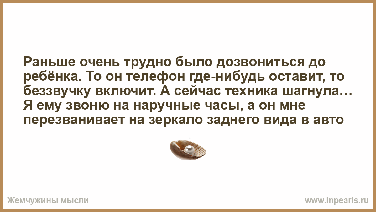 Раньше очень трудно было дозвониться до ребёнка. То он телефон где-нибудь оставит, то беззвучку включит. А сейчас техника шагнула… Я ему звоню на наручные часы, а он мне перезванивает на зеркало заднего вида в авто