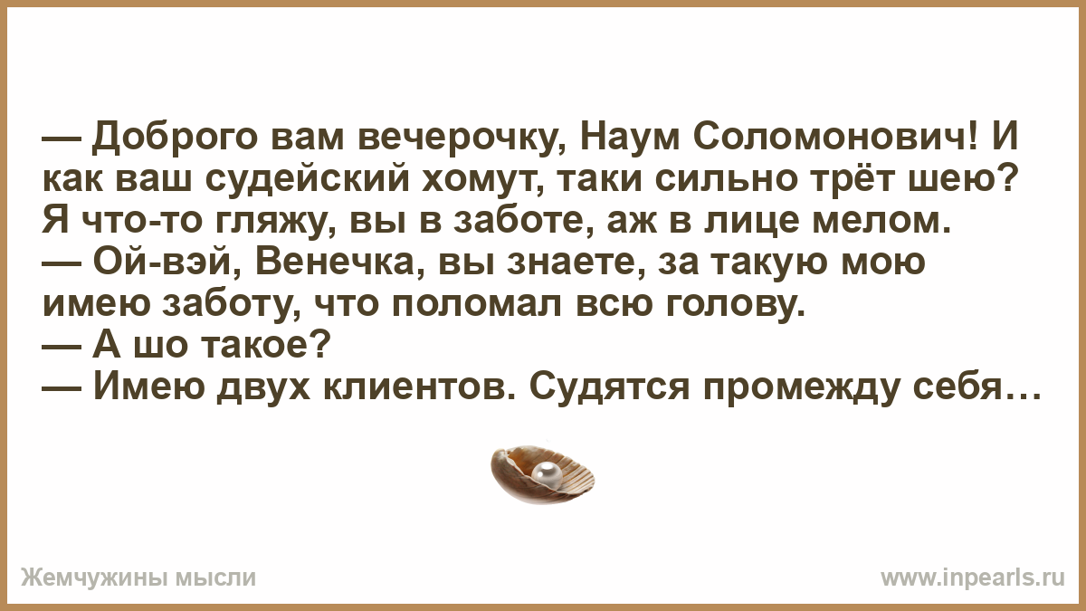 — Доброго вам вечерочку, Наум Соломонович! И как ваш судейский хомут, таки сильно трёт шею? Я что-то гляжу, вы в заботе, аж в лице мелом.