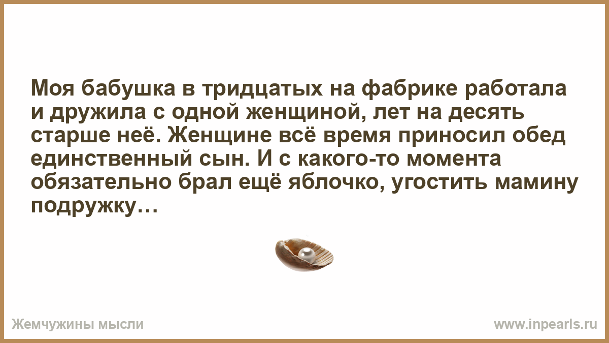Моя бабушка в тридцатых на фабрике работала и дружила с одной женщиной, лет на десять старше неё. Женщине всё время приносил обед единственный сын. И с какого-то момента обязательно брал ещё яблочко, угостить мамину подружку.