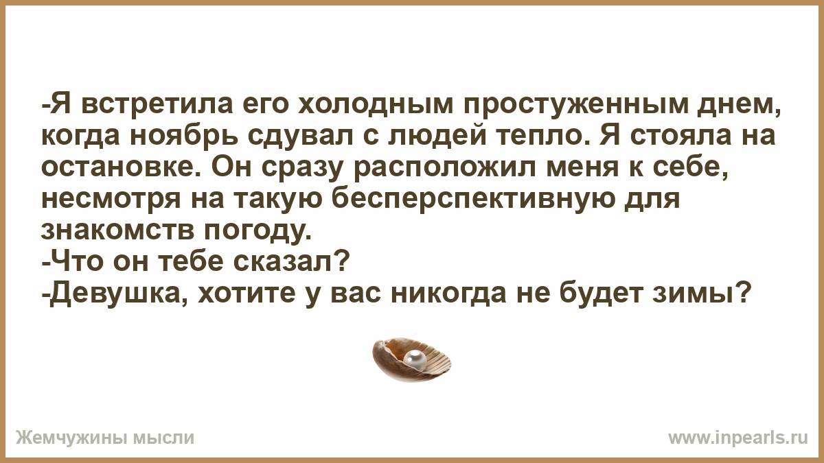 -Я встретила его холодным простуженным днем, когда ноябрь сдувал с людей тепло. Я стояла на остановке. Он сразу расположил меня к себе, несмотря на такую бесперспективную для знакомств погоду.