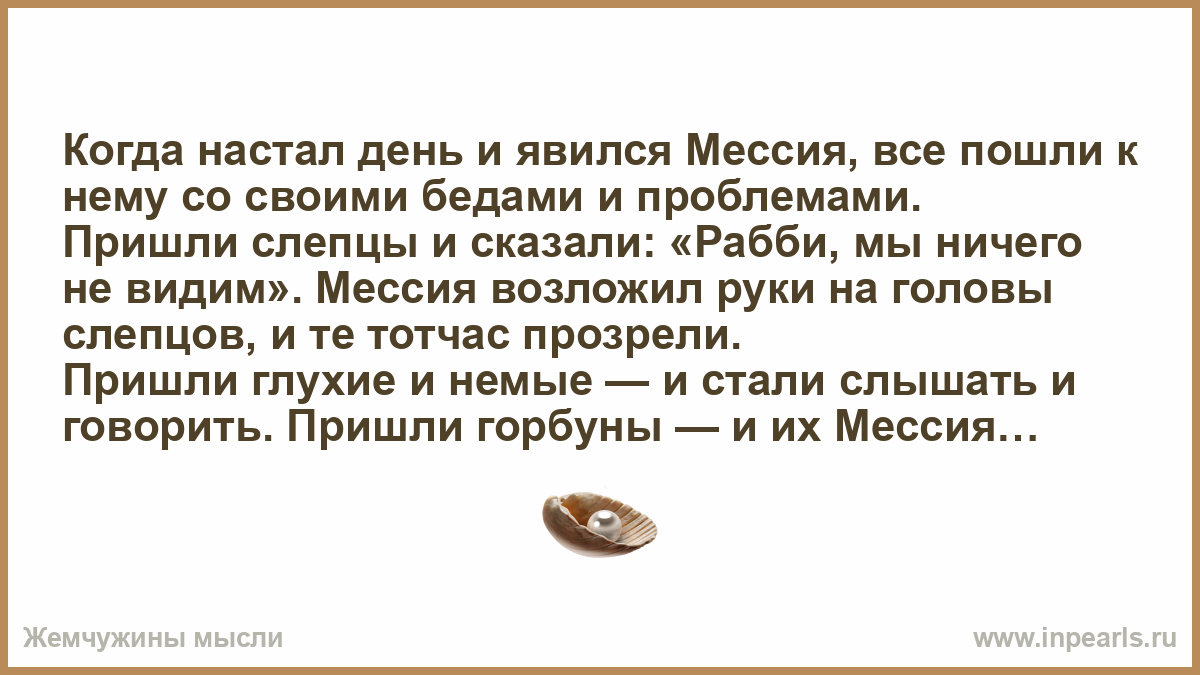 Когда настал день и явился Мессия, все пошли к нему со своими бедами и проблемами.