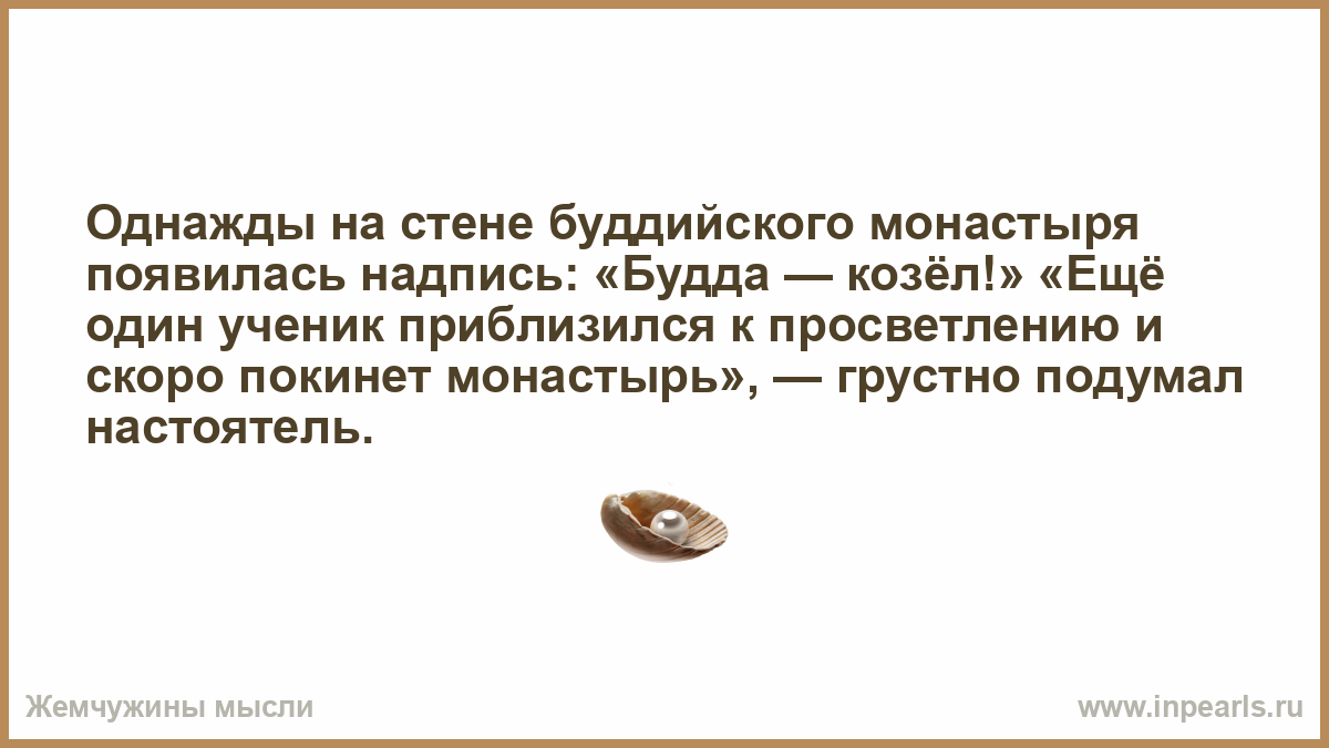 Однажды на стене буддийского монастыря появилась надпись: «Будда — козёл!» «Ещё один ученик приблизился к просветлению и скоро покинет монастырь», — грустно подумал настоятель.