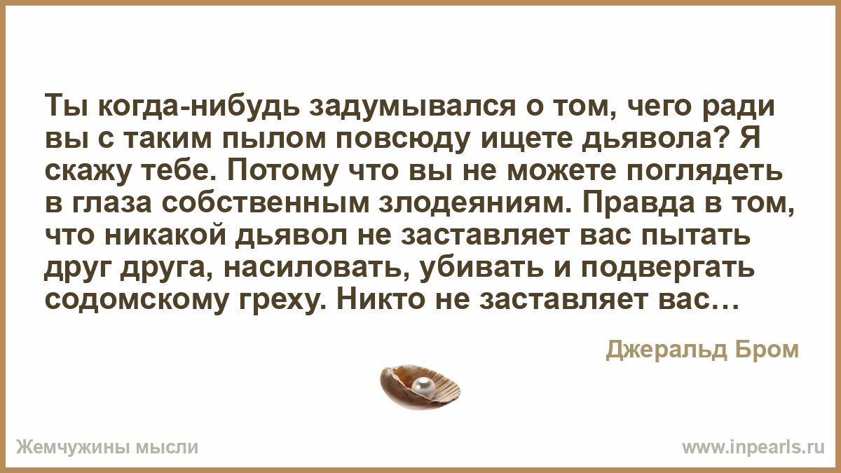 Ты когда-нибудь задумывался о том, чего ради вы с таким пылом повсюду ищете дьявола? Я скажу тебе. Потому что вы не можете поглядеть в глаза собственным злодеяниям. Правда в том, что никакой дьявол не заставляет вас пытать друг друга, насиловать, убивать и подвергать содомскому греху. Никто не заставляет вас уничтожать самую землю, которая кормит вас. Есть только вы. Так что погляди на себя, потому что единственный дьявол здесь — это ты.