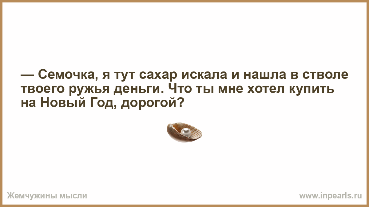 — Семочка, я тут сахар искала и нашла в стволе твоего ружья деньги. Что ты мне хотел купить на Новый Год, дорогой?