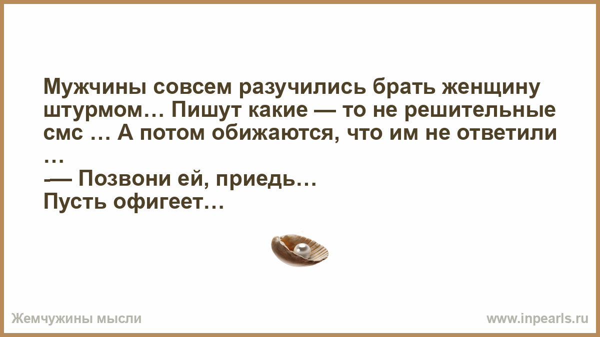 Мужчины совсем разучились брать женщину штурмом… Пишут какие — то не решительные смс … А потом обижаются, что им не ответили … -— Позвони ей, приедь… Пусть офигеет…
