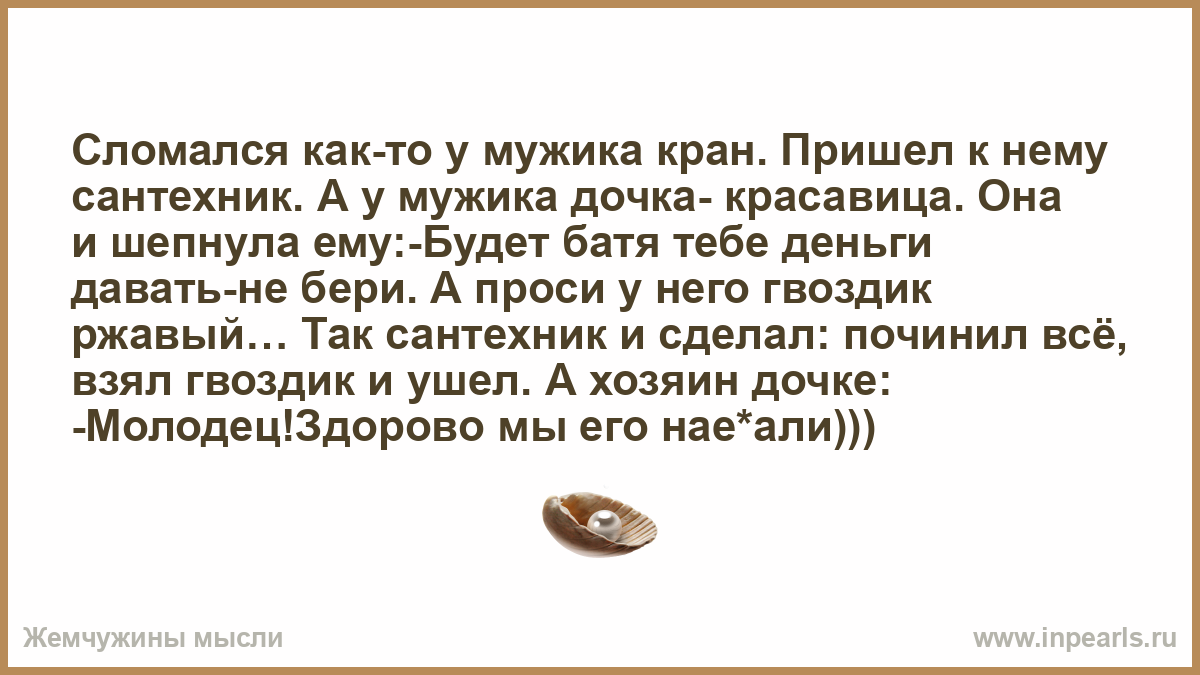 Сломался как-то у мужика кран. Пришел к нему сантехник. А y мужика дочка- красавица. Она и шепнула ему:-Будет батя тебе деньги давать-не бери. А проси y него гвоздик ржавый… Так сантехник и сделал: починил всё, взял гвоздик и ушел. А хозяин дочке: -Молодец!Здорово мы его нае*али)))