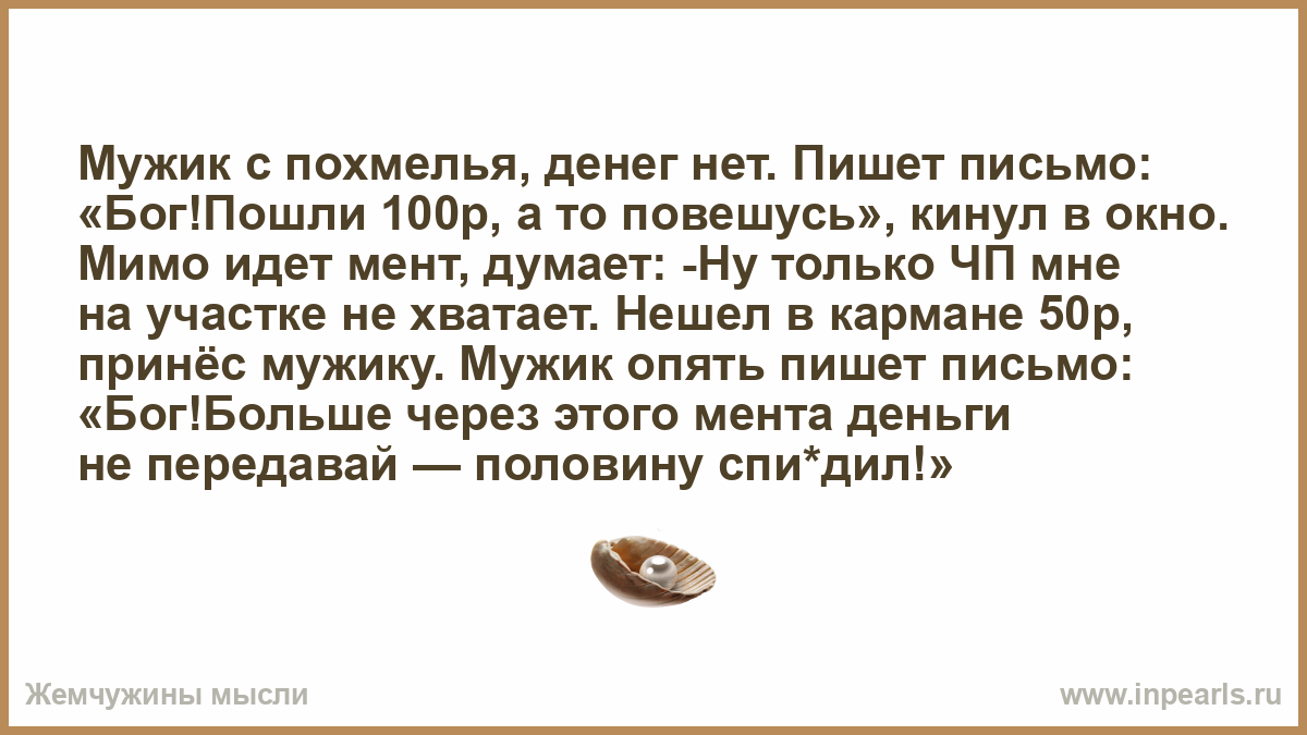Мужик с похмелья, денег нет. Пишет письмо: «Бог!Пошли 100р, а то повешусь», кинул в окно. Мимо идет мент, думает: -Ну только ЧП мне на участке не хватает. Нешел в кармане 50р, принёс мужику. Мужик опять пишет письмо: «Бог!Больше через этого мента деньги не передавай — половину спи*дил!»