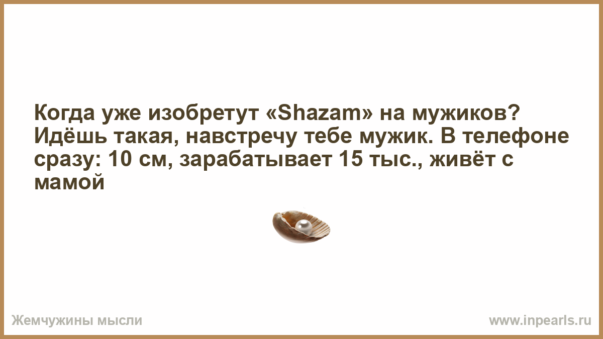 Когда уже изобретут «Shazam» на мужиков? Идёшь такая, навстречу тебе мужик. В телефоне сразу: 10 см, зарабатывает 15 тыс., живёт с мамой