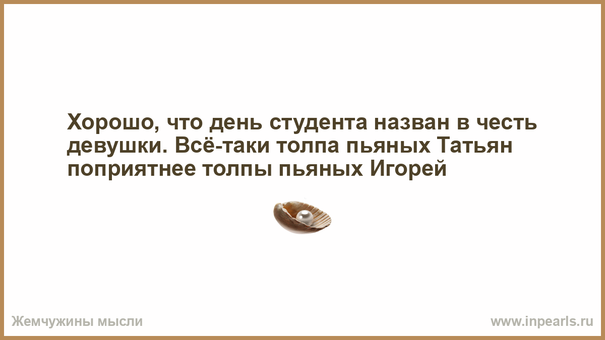 Хорошо, что день студента назван в честь девушки. Всё-таки толпа пьяных Татьян поприятнее толпы пьяных Игорей