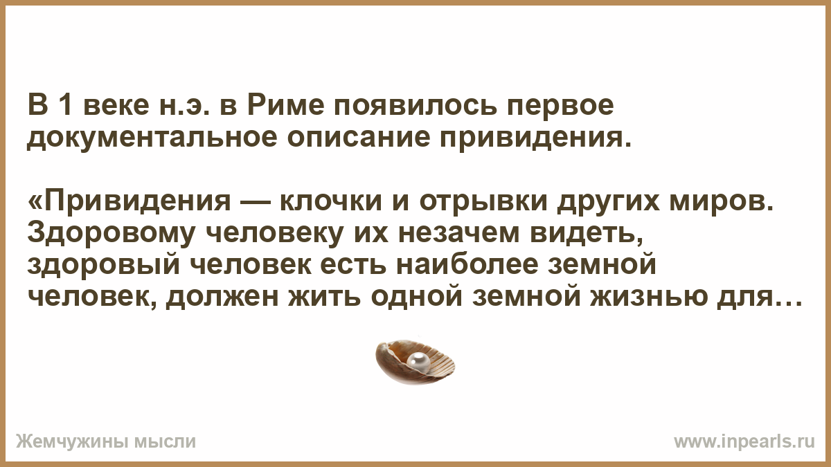 «Привидения — клочки и отрывки других миров. Здоровому человеку их незачем видеть, здоровый человек есть наиболее земной человек, должен жить одной земной жизнью для полноты и порядка. А чуть нарушился нормальный земной порядок в организме, тотчас начинает складываться возможность другого мира, и чем больше болен, тем и соприкосновений с другим миром больше»… /Достоевский/