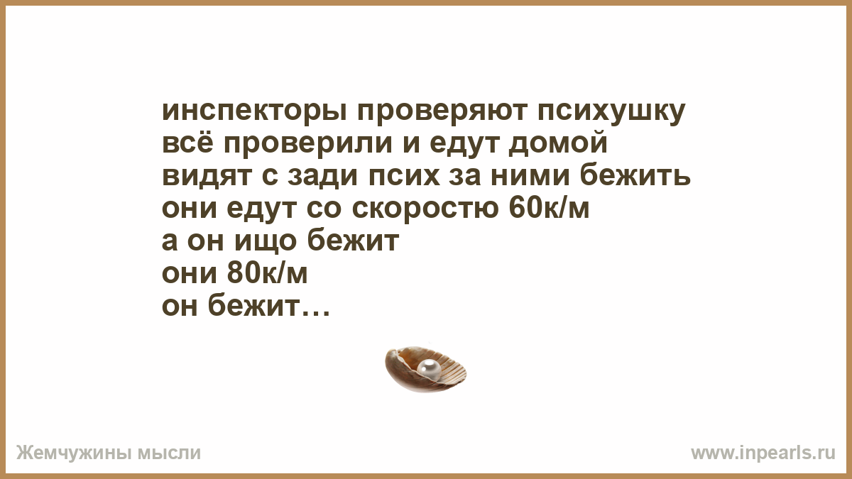 инспекторы проверяют психушку всё проверили и едут домой видят с зади псих за ними бежить они едут со скоростю 60к/м а он ищо бежит они 80к/м он бежит они 120к/м он бежит они выходят с машины и гаварят «что ты хочеш» он «ДАЙ БИБИКНУТЬ»