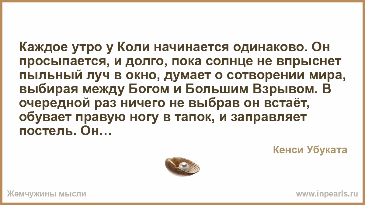 Каждое утро у Коли начинается одинаково. Он просыпается, и долго, пока солнце не впрыснет пыльный луч в окно, думает о сотворении мира, выбирая между Богом и Большим Взрывом. В очередной раз ничего не выбрав он встаёт, обувает правую ногу в тапок, и заправляет постель. Он
