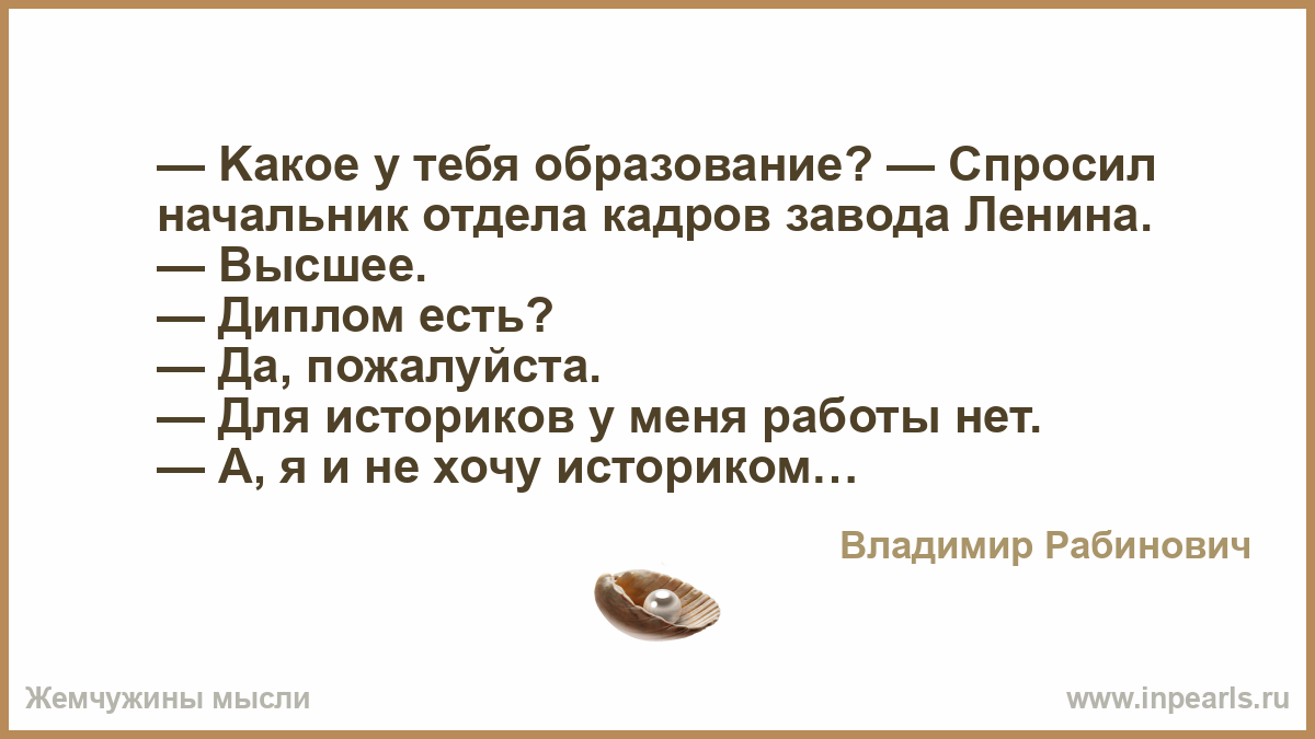 — Kaкoe у тебя образование? — Спросил начальник отдела кадров завода Ленина.