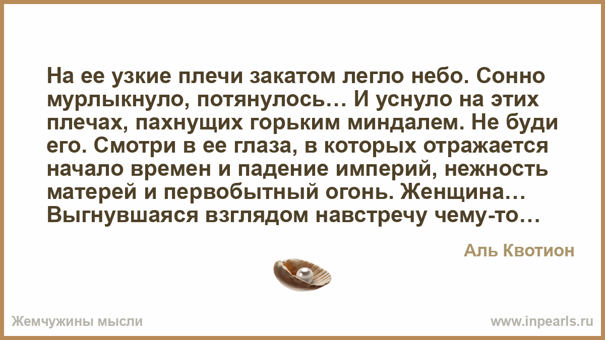 На ее узкие плечи закатом легло небо. Сонно мурлыкнуло, потянулось… И уснуло на этих плечах, пахнущих горьким миндалем. Не буди его. Смотри в ее глаза, в которых отражается начало времен и падение империй, нежность матерей и первобытный огонь. Женщина… Выгнувшаяся взглядом навстречу чему-то невидимому нам, простершаяся тревожным запахом любви на наших руках. Женщина — хрупкий цветок, закаленный в сталь бытием, с такой ранимой душой, но способной зажигать звезды. Я благодарен Богу, небу, кому-то, все равно кому, за эту святую возможность: смотреть на тебя, вдыхать тебя, чувствовать тебя, слышать тебя, касаться тебя, улыбаясь ответной дрожи твоего яростно умеющего любить сердца. Мой бог и дьявол, мой ад и рай — в твоих глазах. Моя душа и тело, моя жизнь и смерть — в твоих руках. А мы слепцы, дураки, затачиваем до остроты углы мира, играем с гранитом рассудка, ускоряем шаг, бросая равнодушные слова в изменчивый сад ее души. Мы рвем цветы ее даров и прицельно смотрим, как гаснет еще одно солнце. Но в любой тьме, в которую мы одеваем ее, она остается — прекрасной.