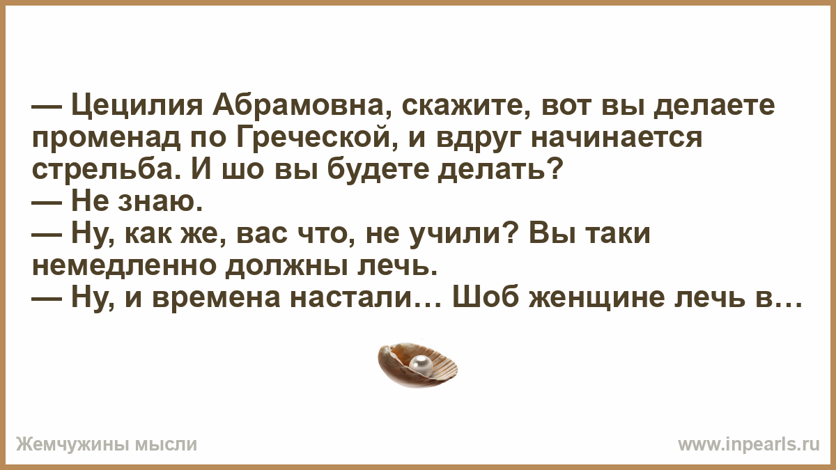 — Цецилия Абрамовна, скажите, вот вы делаете променад по Греческой, и вдруг начинается стрельба. И шо вы будете делать?