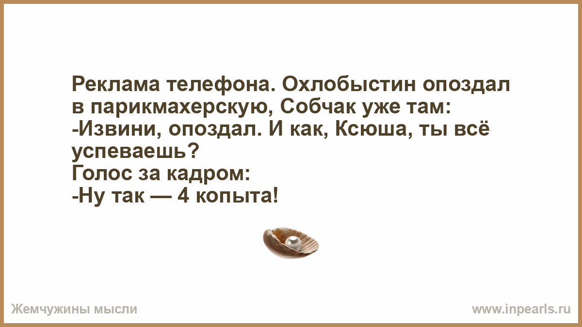 Реклама телефона. Охлобыстин опоздал в парикмахерскую, Собчак уже там: -Извини, опоздал. И как, Ксюша, ты всё успеваешь? Голос за кадром: -Ну так — 4 копыта!