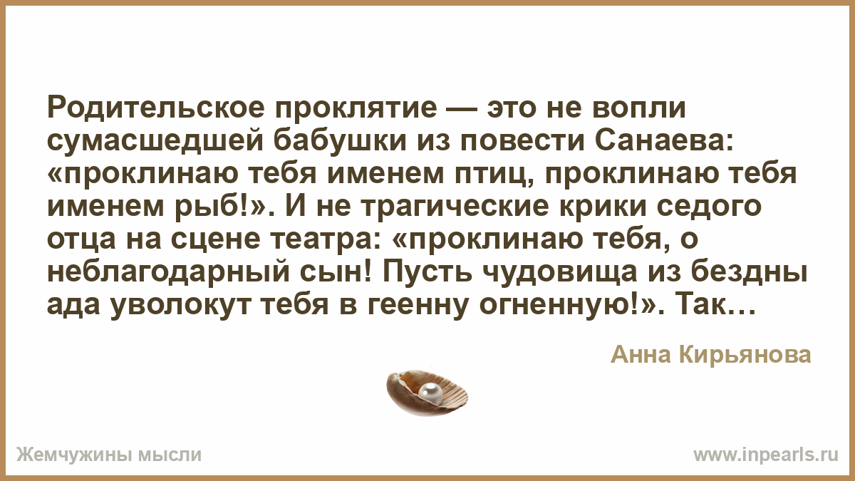 Родительское проклятие — это не вопли сумасшедшей бабушки из повести Санаева: «проклинаю тебя именем птиц, проклинаю тебя именем рыб!». И не трагические крики седого отца на сцене театра: «проклинаю тебя, о неблагодарный сын! Пусть чудовища из бездны ада уволокут тебя в геенну огненную!». Так кричат только в сумасшедшем доме или в старинной пьесе. В реальной жизни никто так не кричит, только ненормальные. Но их вопли — это не проклятие, а симптом психической болезни. Слушать противно, но не опасно.