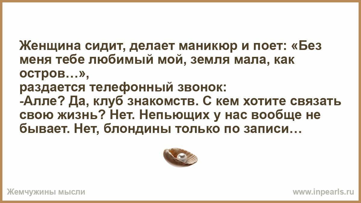 -Алле? Да, клуб знакомств. С кем хотите связать свою жизнь? Нет. Непьющих у нас вообще не бывает. Нет, блондины только по записи.