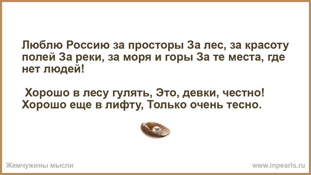 Люблю Россию за просторы За лес, за красоту полей За реки, за моря и горы За те места, где нет людей!