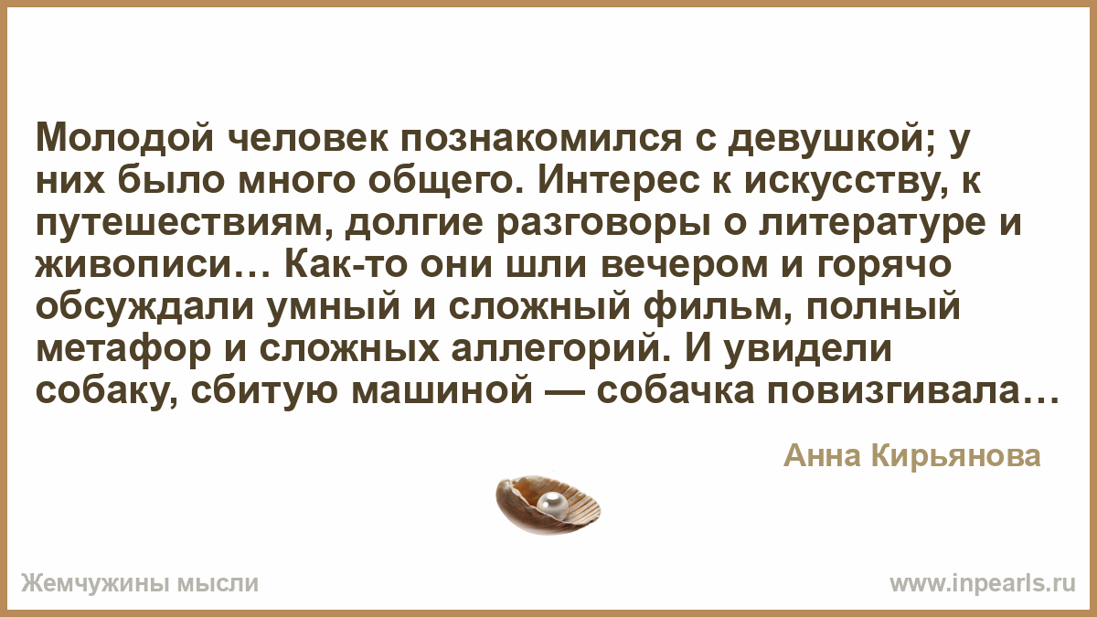 Молодой человек познакомился с девушкой; у них было много общего. Интерес к искусству, к путешествиям, долгие разговоры о литературе и живописи… Как-то они шли вечером и горячо обсуждали умный и сложный фильм, полный метафор и сложных аллегорий. И увидели собаку, сбитую машиной — собачка повизгивала от боли и не могла встать. Юноша наклонился к собаке; стал осматривать ее, сказал, что надо вызвать такси и ехать к ветеринару скорее! И с удивлением услышал: мол, ты с ума сошёл. Пусть эта псина лежит где лежала, не трогай ее, пойдём в кафе, поговорим о фильме! Молодой человек собаку отвёз в клинику и заплатил за приём. Ничего страшного, — так ему сказали. Просто ушиб. Юноша решил взять песика себе. И взял. А вот с девушкой прекратил отношения. Он вспомнил многое: