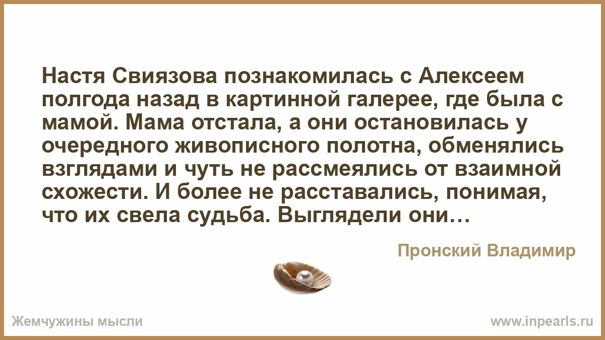 Настя Свиязова познакомилась с Алексеем полгода назад в картинной галерее, где была с мамой. Мама отстала, а они остановилась у очередного живописного полотна, обменялись взглядами и чуть не рассмеялись от взаимной схожести. И более не расставались, понимая, что их свела судьба. Выглядели они действительно как близнецы: высокие, стройные, с удивительно светлыми, словно льняными, слегка волнистыми волосами, оба синеглазые, чертами лица похожие. Никто потом не верил, что они — не брат и сестра, и в шутку говорили, что от них пойдёт новая порода.