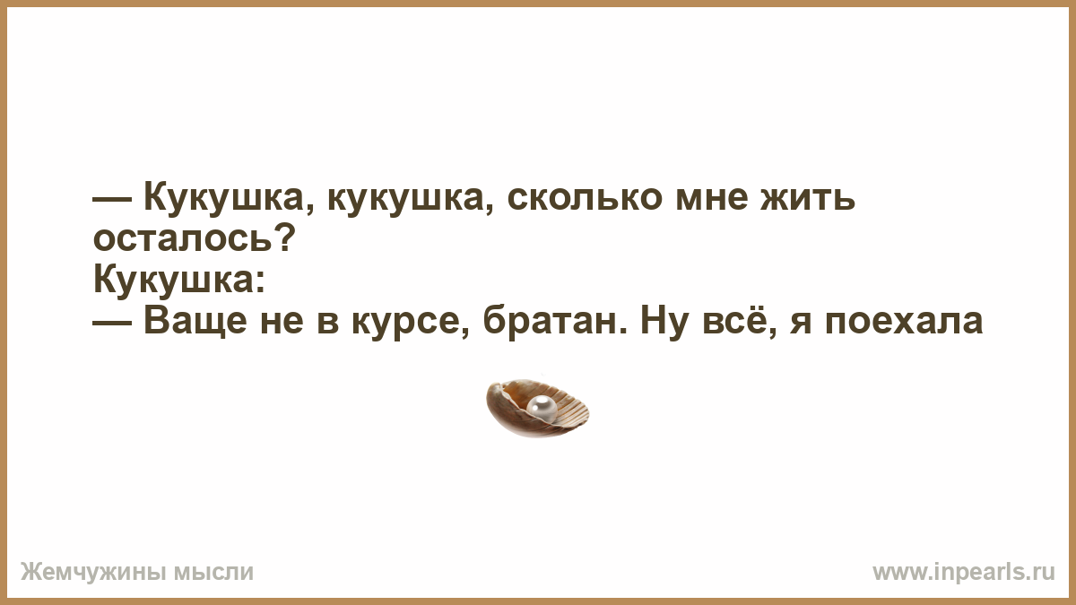 — Кукушка, кукушка, сколько мне жить осталось? Кукушка: — Ваще не в курсе, братан. Ну всё, я поехала