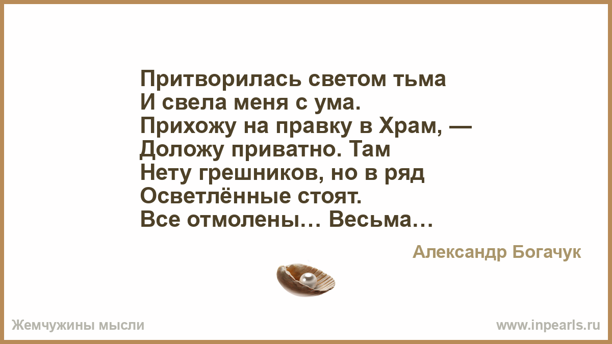 Притворилась светом тьма И свела меня с ума. Прихожу на правку в Храм, — Доложу приватно. Там Нету грешников, но в ряд Осветлённые стоят. Все отмолены… Весьма Освятилась светом тьма.