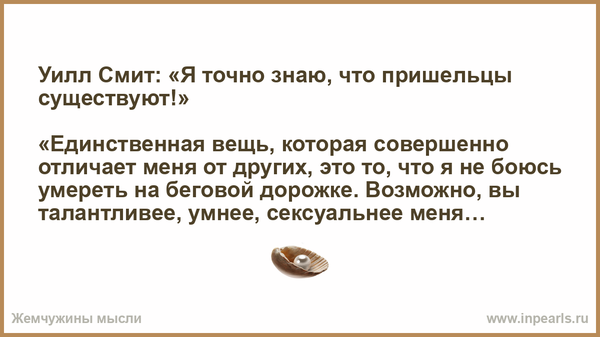 «Единственная вещь, которая совершенно отличает меня от других, это то, что я не боюсь умереть на беговой дорожке. Возможно, вы талантливее, умнее, сексуальнее меня, возможно, вы лучше меня по всем категориям, но если мы выходим на беговую дорожку вместе, то есть два варианта: вы сдаетесь первым или я умру». (Уилл Смит, голливудский актер).