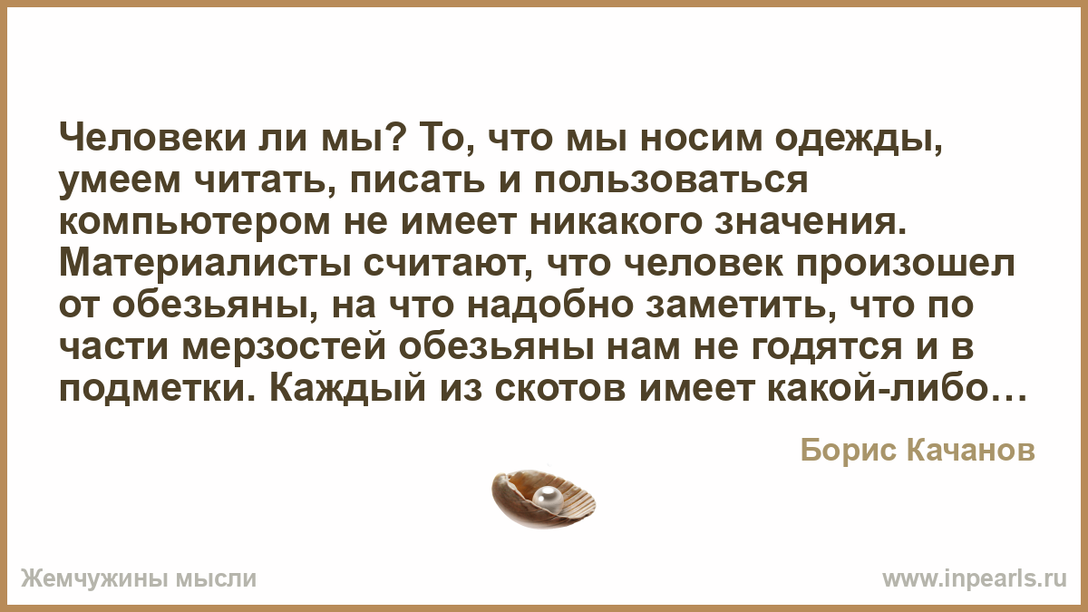 Человеки ли мы? То, что мы носим одежды, умеем читать, писать и пользоваться компьютером не имеет никакого значения. Материалисты считают, что человек произошел от обезьяны, на что надобно заметить, что по части мерзостей обезьяны нам не годятся и в подметки. Каждый из скотов имеет какой-либо один недостаток — волк хищен, лиса пронырлива, верблюд злопамятен, змея ядовита, заяц труслив, а человек совокупил в себе все, да еще добавил от себя, о чем и поведал Святитель Иоанн Златоуст. Скоты не копят денег, не изобретают орудия для истребления себе подобных, не блудят круглый год, не тщеславятся и не убивают детенышей в своем чреве абортами. Они не изобретают нелепые одежды, не употребляют наркотиков, не занимаются порнографией и не упиваются до бесчувствия. Им неведомы торговля органами, содомский грех и лесбийская любовь. Они не мажут свои морды смехотворными красками и не делают немыслимых причесок. Скоты не презирают бедных, не хвалятся, чья машина лучше и чей счет в банке больше. Получается, что они значительно чище и нравственнее нас, людей. (Б.О. Качанов. Карта, байда, два весла. М.: Маска, 2012, стр. 106−107)