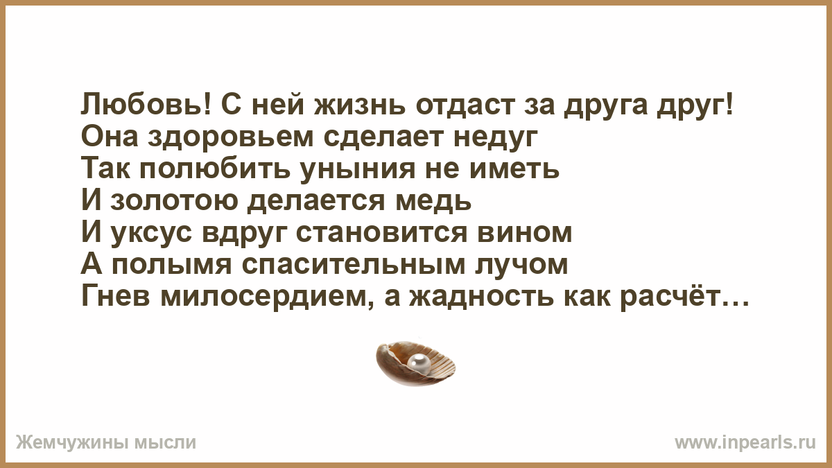 Любовь! С ней жизнь отдаст за друга друг! Она здоровьем сделает недуг Так полюбить уныния не иметь И золотою делается медь И уксус вдруг становится вином А полымя спасительным лучом Гнев милосердием, а жадность как расчёт И ангелом с Ней стать способен чёрт С ней камень масло, с нею жало мёд А без неё железом воск дерёт Любовь! Да с нею гильотина словно Трон! С ней в мёртвом больше жизни чем в живом Царь без неё становится рабом В ней Мудрости основа и венец И никогда Любовью не владел подлец.