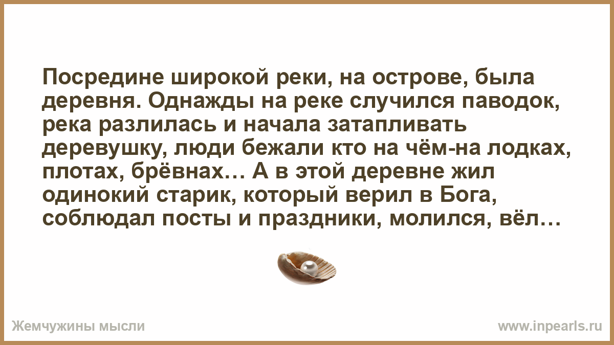 Посредине широкой реки, на острове, была деревня. Однажды на реке случился паводок, река разлилась и начала затапливать деревушку, люди бежали кто на чём-на лодках, плотах, брёвнах… А в этой деревне жил одинокий старик, который верил в Бога, соблюдал посты и праздники, молился, вёл праведную жизнь… И не досталось ему плота или замешкался-в общем, остался он на островке один, а вода накатывает, уже весь остров покрылся тоненьким слоем воды… Люди с берега собираются за ним лодку посылать, а он им и говорит-Бог всемогущ, он спасет меня! Вот и взмолился старик:" Господи! вся жизнь моя у тебя как на ладони! Верил в тебя, заповеди соблюдал, не покинь же меня! Спаси, Господи!" и вдруг видит-плывёт по реке корабль громадный, красвый, на палубе народ, оттуда ему круги спасательные кидают… А дед всё своё твердит-«Меня Бог спасёт!» уплыл корабль… а вода прибывает, уже до колен дошла… Всплывает подводная лодка-на ней моряки уже лодку снаряжают-старика спасать, а он всё твердит-«Спасибо, меня мой Бог спасёт!» Уплыла лодка. Вода уже по-пояс, холодная… Летит вертолёт, с него лестницы спускают-«Дед, хватайся!» А дед всё своё повторяет:"Не надо вашей помощи, меня Бог спасёт!" так и потонул…