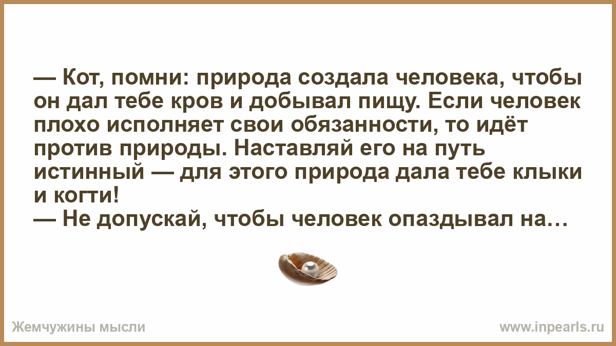 — Кот, помни: природа создала человека, чтобы он дал тебе кров и добывал пищу. Если человек плохо исполняет свои обязанности, то идёт против природы. Наставляй его на путь истинный — для этого природа дала тебе клыки и когти!
