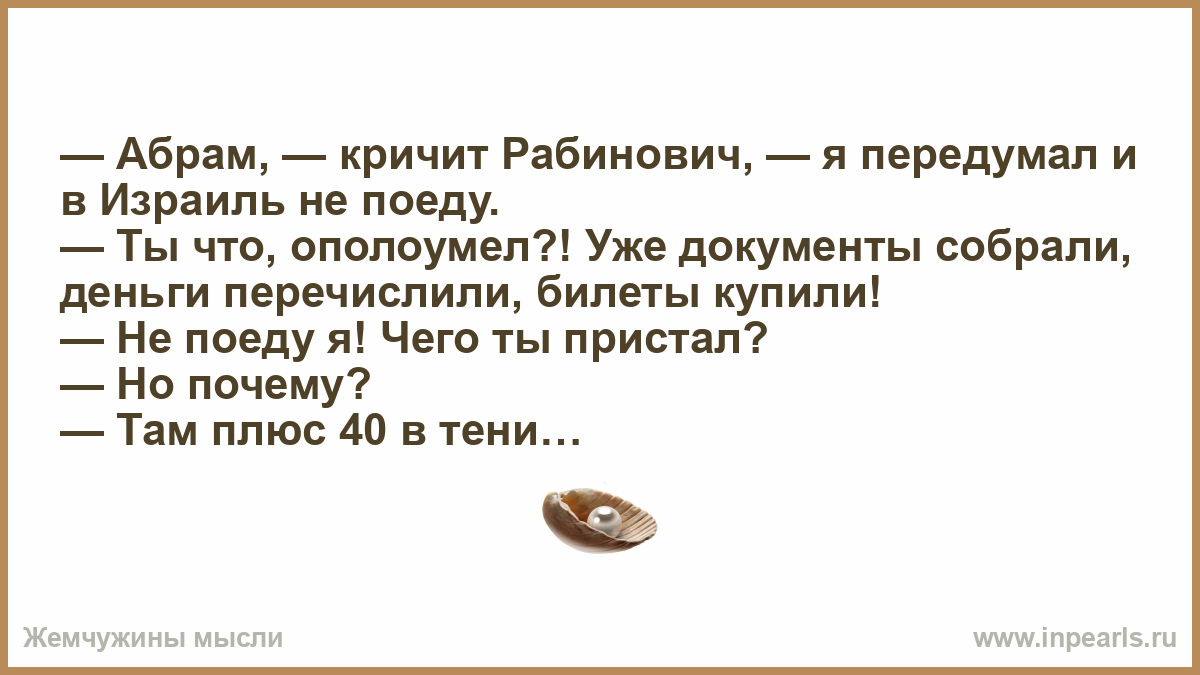 — Абрам, — кричит Рабинович, — я передумал и в Израиль не поеду.