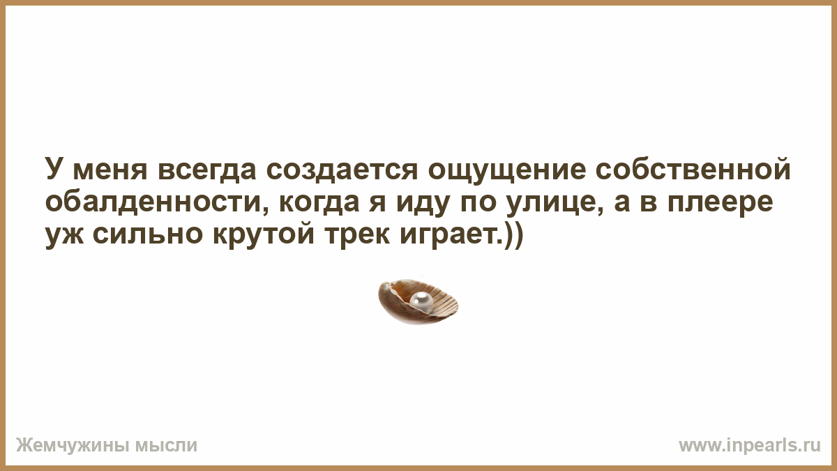 У меня всегда создается ощущение собственной обалденности, когда я иду по улице, а в плеере уж сильно крутой трек играет.))