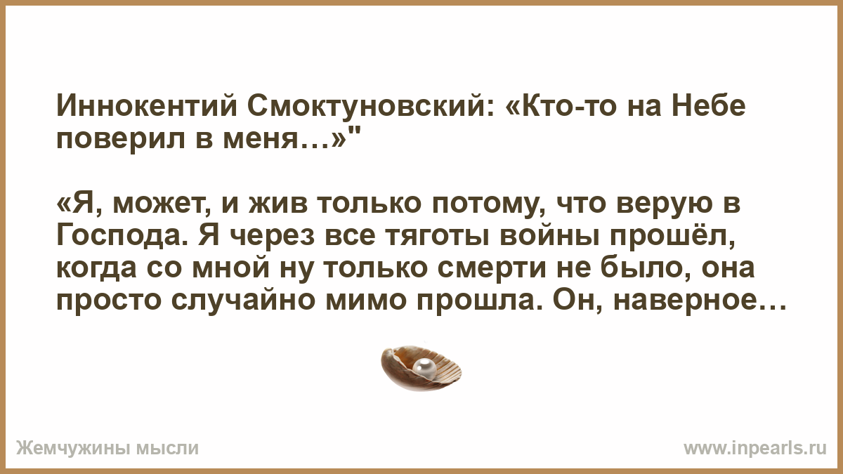 «Я, может, и жив только потому, что верую в Господа. Я через все тяготы войны прошёл, когда со мной ну только смерти не было, она просто случайно мимо прошла. Он, наверное, берег меня для каких-то маленьких моих свершений…