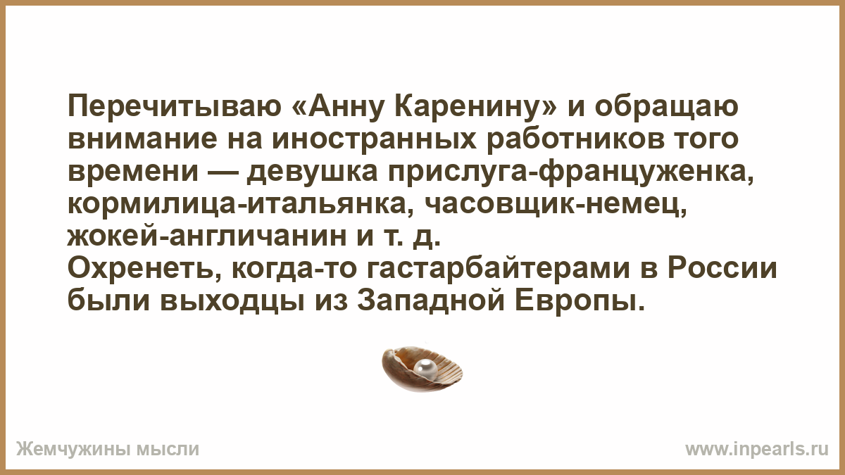 Перечитываю «Анну Каренину» и обращаю внимание на иностранных работников того времени — девушка прислуга-француженка, кормилица-итальянка, часовщик-немец, жокей-англичанин и т. д.